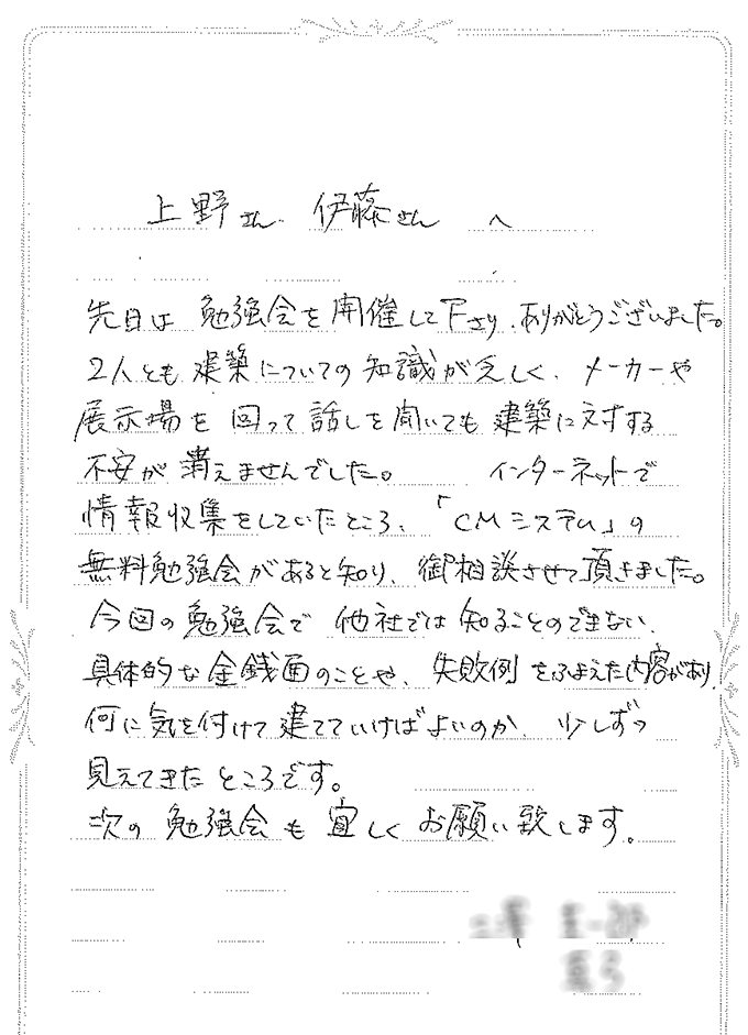 1回目の住宅メーカーの裏側の話など私達にもびっくりするお話ばかりで、「本当にそんなことまで話して良いのかなぁ」と思う程でした。2回・3回目と勉強会が進んで行き、何も知らないまま住宅メーカーなど回っていたら…と思うと、恐ろしくなると同時に、上野さんに出会えた事に感謝しております。