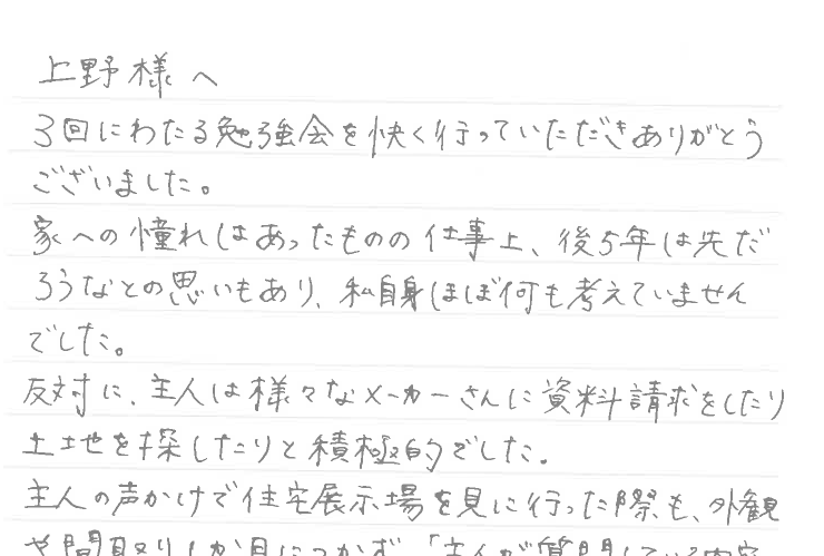 上野様 先日の勉強会ではお世話になり、有難うございました。漠然と家が欲しいと思い、何から始めれば良いのか分からなかった私達ですが、最初に上野さんにお話しを伺って良かったと思っています。住宅展示場など回った事もなく、家の事などほとんど何も知らないド素人の私達にも、とても分かりやすく、とても為になる話でした。